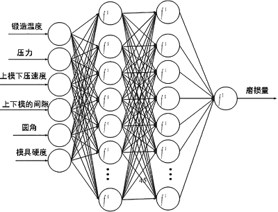 本神經(jīng)網(wǎng)絡(luò)模型采用擁有兩個(gè)隱藏層的四層神經(jīng)網(wǎng)絡(luò)結(jié)構(gòu),如圖31所示,輸入層有6個(gè)神經(jīng)元,即為對熱模鍛過程中模具的磨損量造成影響的參數(shù)(鍛造的溫度。壓力,圓角半徑、上模下壓的速度、模具的硬度和上下模的間隙)。隱藏層1和2都采用1個(gè)神經(jīng)元,輸出層即為模具的磨損量。輸入層和隱藏層的函數(shù)連接采用logsig,隱藏層和輸出層的函數(shù)采用tansig。