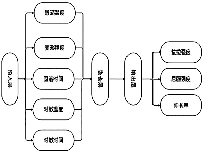 構(gòu)建的神經(jīng)網(wǎng)絡(luò)模型采用三層結(jié)構(gòu),即輸入層、隱含層和輸出層。模型結(jié)構(gòu)如圖33所示,輸入層的參數(shù)分別是鍛造溫度、變形程度、固溶時(shí)間、時(shí)效溫度、時(shí)效時(shí)間,輸出層的參數(shù)為抗拉強(qiáng)度、屈服強(qiáng)度、伸長率。