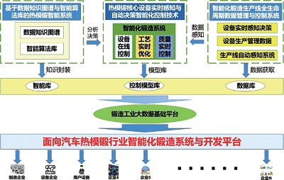 本項(xiàng)目構(gòu)建鍛造系統(tǒng)數(shù)據(jù)知識圖譜與智能算法庫,形成汽車典型零件熱模鍛智能庫,研究熱模鍛核心設(shè)備實(shí)時(shí)感知與自動(dòng)決策智能化控制技術(shù),建立鍛造生產(chǎn)線鍛件幾何結(jié)構(gòu)、工藝數(shù)據(jù)、生產(chǎn)過程與成形質(zhì)量數(shù)據(jù)等在內(nèi)的產(chǎn)品全生命周期數(shù)據(jù)管理與控制系統(tǒng),開發(fā)一套面向汽車行業(yè)熱模鍛智能化鍛造系統(tǒng),實(shí)現(xiàn)智能化鍛造大數(shù)據(jù)分析模型與算法、優(yōu)化決策模型與算法的封裝,形成智能熱模鍛工業(yè)大數(shù)據(jù)綜合技術(shù)服務(wù)平臺,為不少于50家浙江省汽車零配件熱模鍛中小企業(yè)開放服務(wù),本項(xiàng)目的整體研究內(nèi)容與路線架構(gòu)圖如圖34所示。