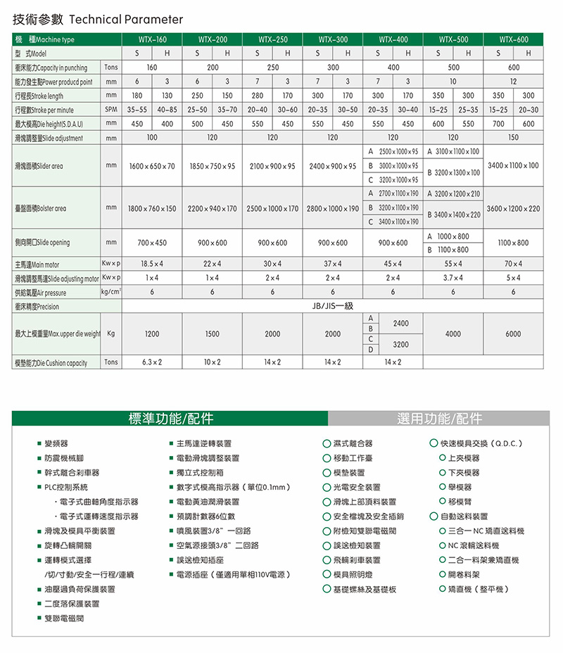 WTX系列沖床機身具有極高之剛性、良好之精度及較大之床面,可適用連續(xù)加工順送之下料、沖孔、成形、引伸等加工,并可選擇性加裝移動臺車,以達快速換模之目的。此種機型特別適用于汽車、摩托車、五金、家電等制品之沖壓加工。