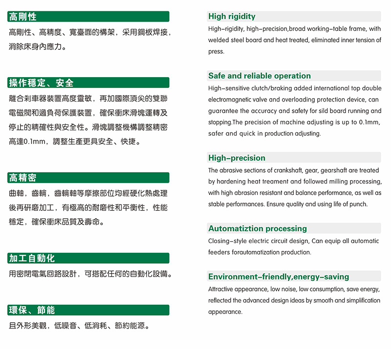 WG2(系列開式雙曲軸精密鋼架沖床)--適用于長而寬鈑金物料之剪裁、沖孔、彎曲等多用途加工,如馬達外殼、汽車零件、家用產品、電腦主機外殼、錄音機及音樂底盤、電源供應器底盤等。其寬敞的臺盤和開口不僅有利于單工程或多工程模式的作業(yè),對于二次元、三次元的自動移送裝置或配有伺服傳動的機械手亦能輕易配合,從而達成多用途的自動送料。